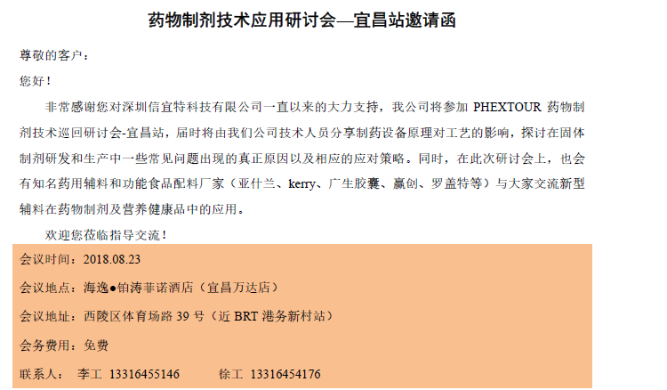 非常感謝您對深圳信宜特科技有限公司一直以來的大力支持,我公司將參加PHEXTOUR藥物制 劑技術巡回研討會宜昌站,屆時將由我們公司技術人員分享制藥設備原理對工藝的影響,探討在固體 制劑研發(fā)和生產(chǎn)中一些常見問題出現(xiàn)的真正原因以及相應的應對策略。同時,在此次研討會上,也會 有知名藥用輔料和功能食品配料廠家(亞什蘭、kenry、 廣生膠囊、贏創(chuàng)、羅蓋特等)與大家交流新型 輔料在藥物制劑及營養(yǎng)健康品中的應用。